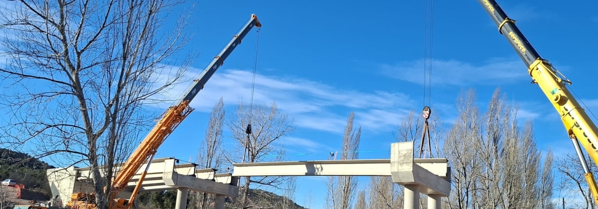 Esta semana se han llevado a cabo los trabajos de izado y colocación de las vigas prefabricadas del puente sobre el río Mijares correspondiente a la UE04, actuación en la que ejercemos la Dirección de Obra.