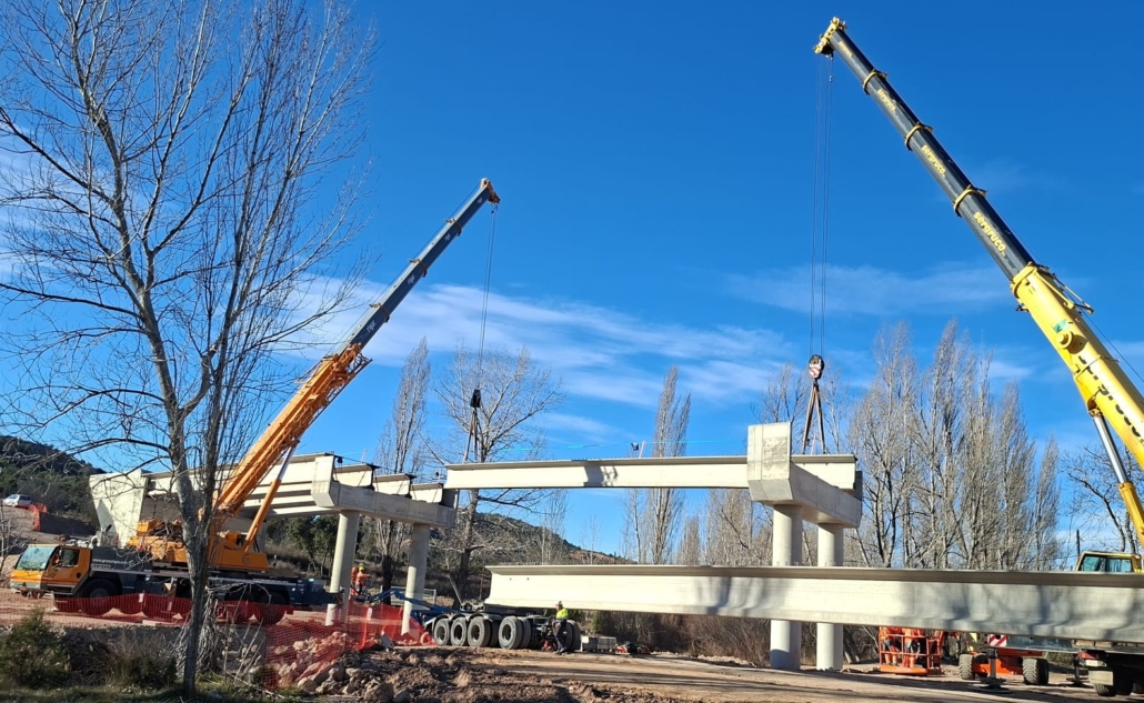 Esta semana se han llevado a cabo los trabajos de izado y colocación de las vigas prefabricadas del puente sobre el río Mijares correspondiente a la UE04, actuación en la que ejercemos la Dirección de Obra.